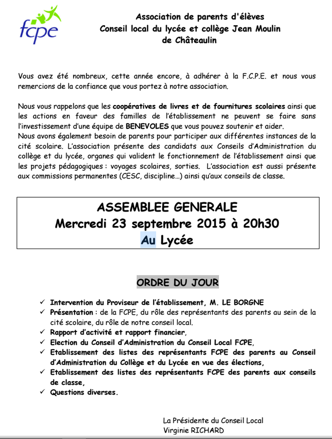 Assemblée Générale FCPE mercredi 23 septembre à 20H30 17 septembre 2015 par Jean Moulin Chateaulin, publié dans ancienne actualité J’aime chargement… Similaire