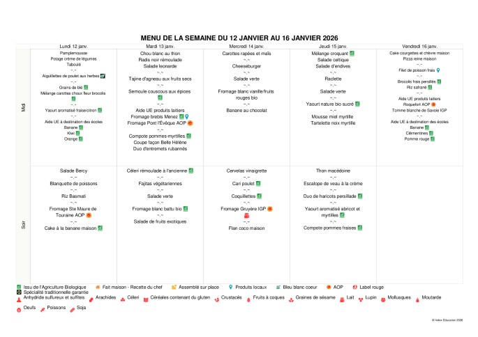 Menu de la semaine 17 novembre 20159 janvier 2026 par Jean Moulin Chateaulin, publié dans Actualités Liste des allergènes de la semaine sous réserve d’omissions et de modifications du menu du fait des aléas du service. Compte-rendu du jury de la commission d’instruction de label bio et engagé du 17 avril 2025. Plus d’informations sur le site ma-cantine.gouv.fr Partager : Partager sur X(ouvre dans une nouvelle fenêtre) X Partager sur Facebook(ouvre dans une nouvelle fenêtre) Facebook J’aime chargement… Similaire
