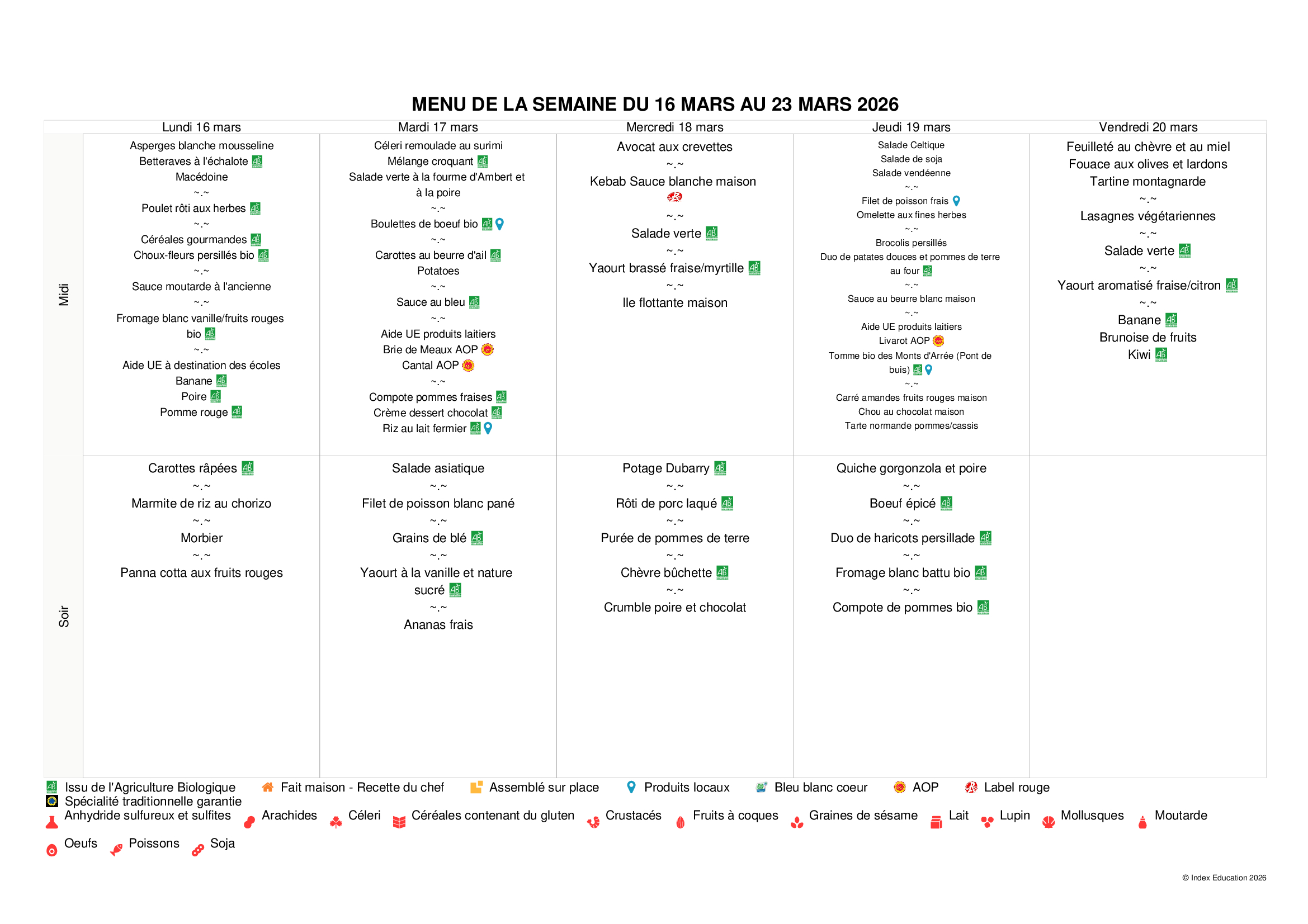 Menu de la semaine 17 novembre 201516 mars 2026 par Jean Moulin Chateaulin, publié dans Actualités Liste des allergènes de la semaine sous réserve d’omissions et de modifications du menu du fait des aléas du service. Compte-rendu du jury de la commission d’instruction de label bio et engagé du 17 avril 2025. Plus d’informations sur le site ma-cantine.gouv.fr Partager : Partager sur X(ouvre dans une nouvelle fenêtre) X Partager sur Facebook(ouvre dans une nouvelle fenêtre) Facebook J’aime chargement… Similaire