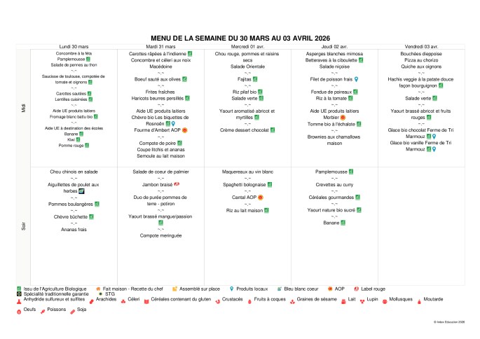 Menu de la semaine 17 novembre 20151 avril 2026 par Jean Moulin Chateaulin, publié dans Actualités Liste des allergènes de la semaine sous réserve d’omissions et de modifications du menu du fait des aléas du service. Compte-rendu du jury de la commission d’instruction de label bio et engagé du 17 avril 2025. Plus d’informations sur le site ma-cantine.gouv.fr Partager : Partager sur X(ouvre dans une nouvelle fenêtre) X Partager sur Facebook(ouvre dans une nouvelle fenêtre) Facebook J’aime chargement… Similaire