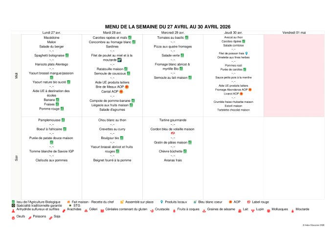 Menu de la semaine 17 novembre 201510 avril 2026 par Jean Moulin Chateaulin, publié dans Actualités Liste des allergènes de la semaine sous réserve d’omissions et de modifications du menu du fait des aléas du service. Compte-rendu du jury de la commission d’instruction de label bio et engagé du 17 avril 2025. Plus d’informations sur le site ma-cantine.gouv.fr Partager : Partager sur X(ouvre dans une nouvelle fenêtre) X Partager sur Facebook(ouvre dans une nouvelle fenêtre) Facebook J’aime chargement… Similaire