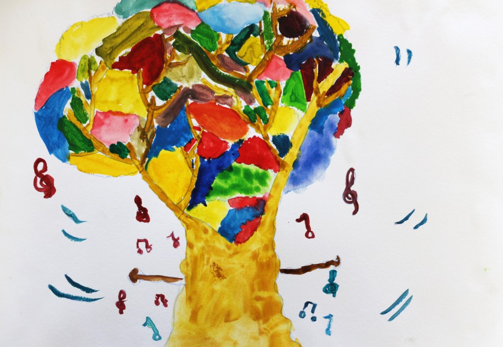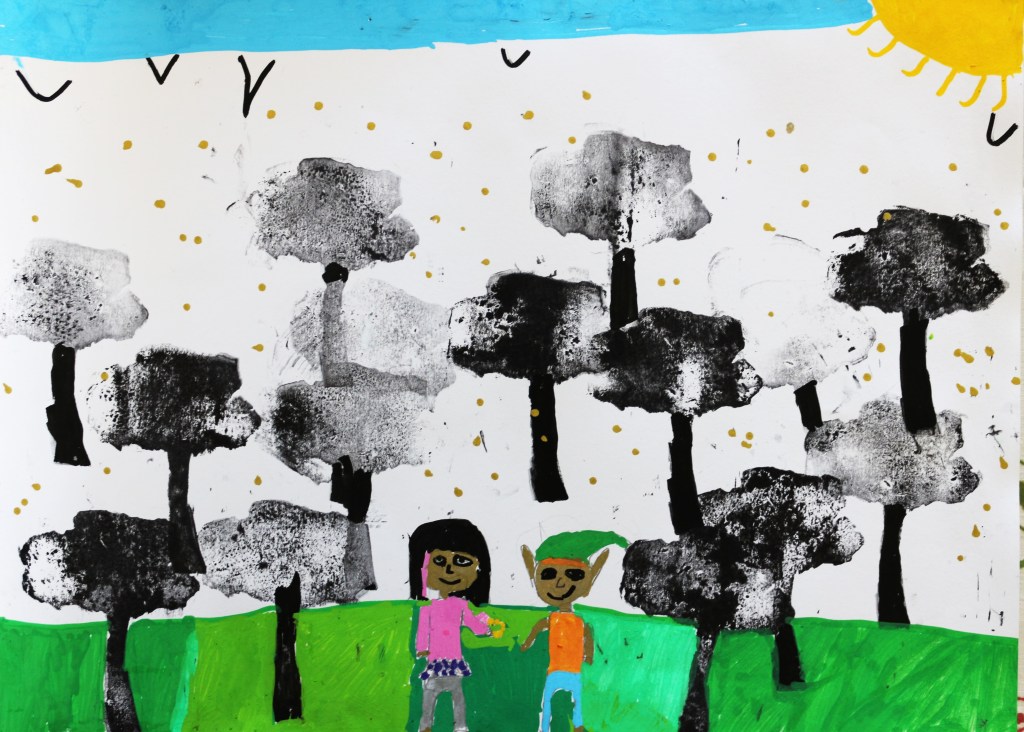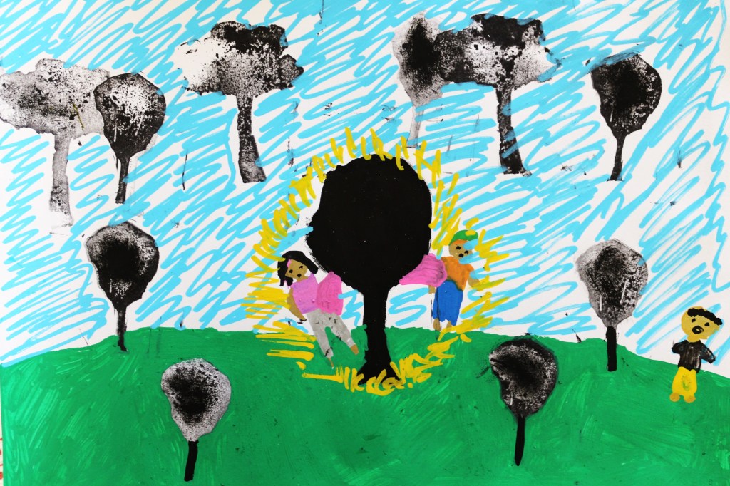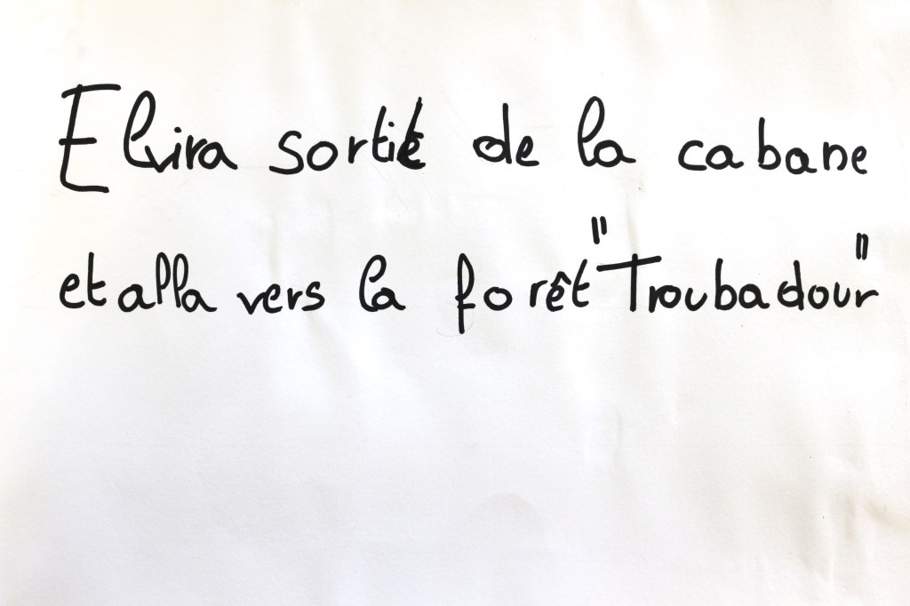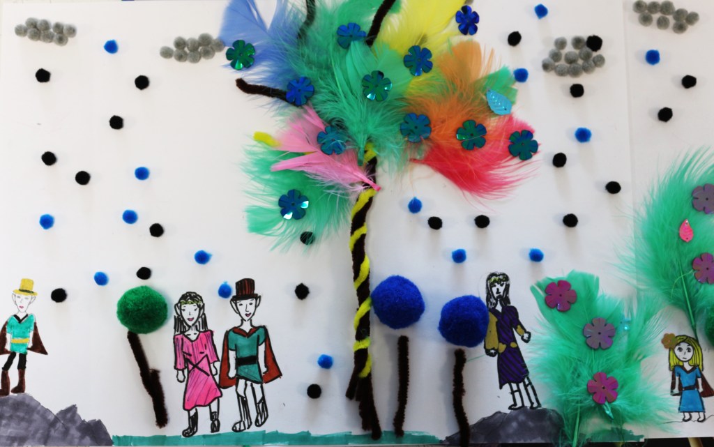 Nous avons orienté le thème de la forêt vers ‘l’arbre magique’, déclencheur d’imaginaire, et suivi les codes du conte dans le chemin d’écriture mené par Mme Blouet Da Mota, professeure de français. Les élèves ont co-rédigé par petits groupes (6 au total sur l’ensemble de la classe) et conservé cette dimension collective pendant la phase de création plastique.