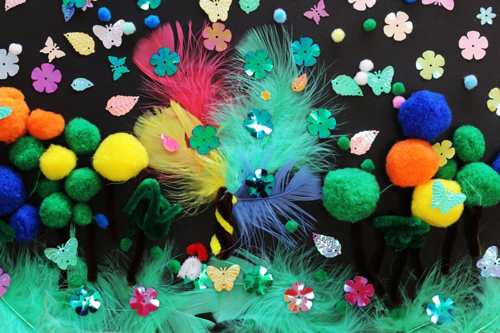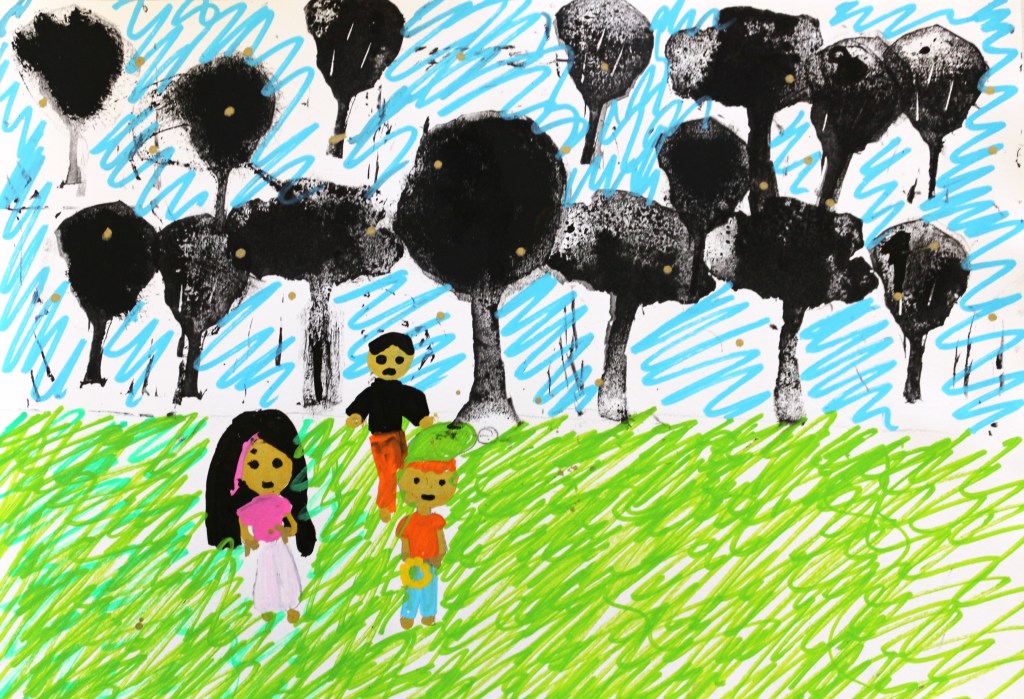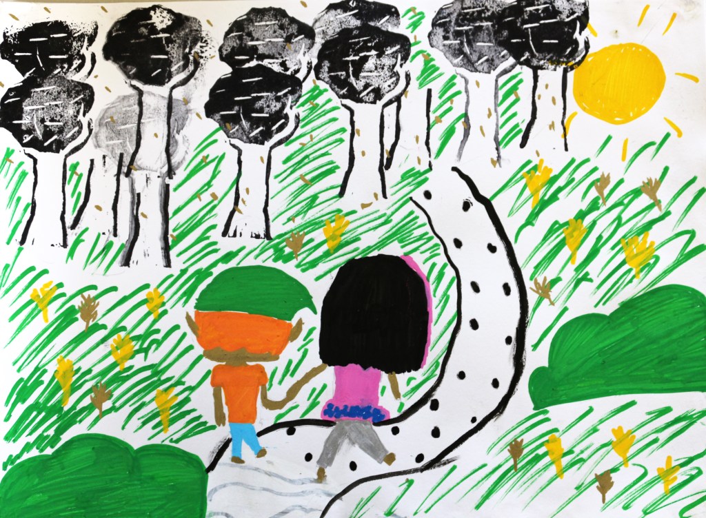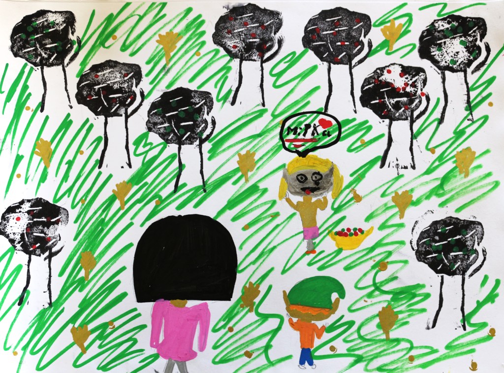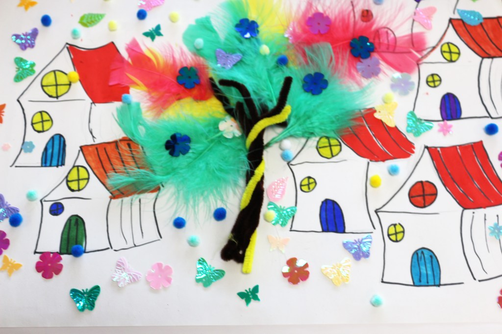 Nous avons orienté le thème de la forêt vers ‘l’arbre magique’, déclencheur d’imaginaire, et suivi les codes du conte dans le chemin d’écriture mené par Mme Blouet Da Mota, professeure de français. Les élèves ont co-rédigé par petits groupes (6 au total sur l’ensemble de la classe) et conservé cette dimension collective pendant la phase de création plastique.
