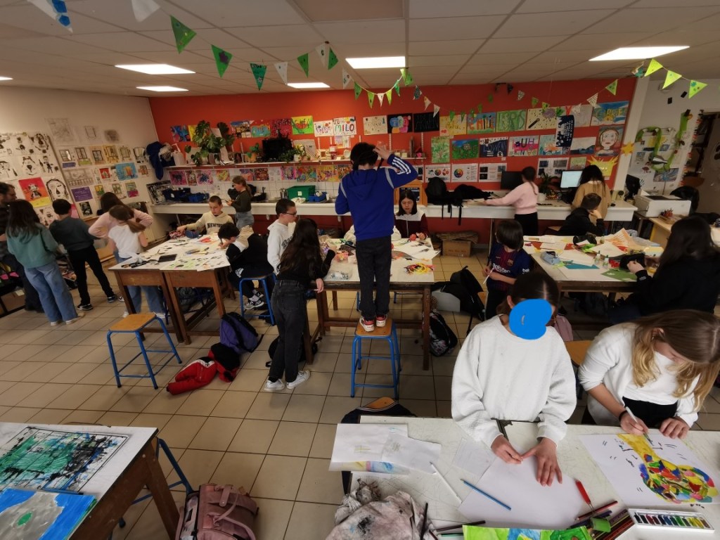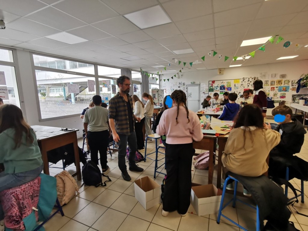 Ce projet s’est déroulé sur plusieurs semaines avec une classe de sixième composée de 29 élèves, de mi-décembre à fin mars, avec comme point d’orgue l’intervention de l’artiste, graphiste et illustrateur de livres jeunesse Yann LE BRAS au collège.