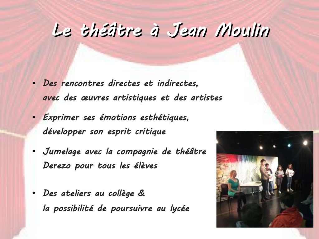 Le spectacle des 3èmes sera rejoué devant les 6èmes 5 le jeudi 30 mai de 9h à 10h et celui des 4èmes 3 devant les 5èmes 3 le jeudi 30 mai de 16h10 à 17h25