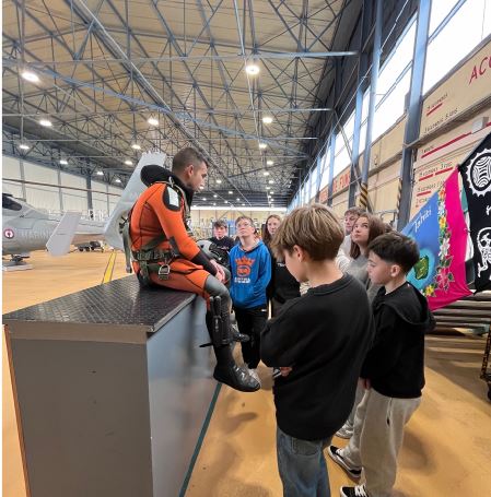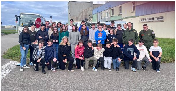 Le jeudi 10 octobre, les élèves de la classe de Défense de 4*5 ont été invités à passer la journée sur la base aéronavale de Lanvéoc-Poulmic. Ils ont été accueillis par la Commandant Anne-Charlotte, le lieutenant de vaisseau Pierre et l’enseigne de vaisseau Alexandre. La journée a été riche en découvertes : la présentation de la flottille 34F, les marins-pompiers de la BAN, le site du CESSAN (Centre d’entraînement à la survie et au sauvetage de l’Aéronautique navale), une rencontre avec des plongeurs embarqués sur les hélicoptères tout juste débarqués de leurs vols, une initiation au simulateur de pilotage d’hélicoptères, un embarquement virtuel à bord d’un hélicoptère via un casque de réalité virtuelle. Le temps du déjeuner a été un moment de partage avec les militaires. La Commandant a également remis un chèque de parrainage pour le cross solidaire. Le mardi 8 octobre, trois membres de la 34F (la lieutenant de vaisseau Christel, le lieutenant de vaisseau Pierre et l’enseigne de vaisseau Alexandre) ont accompagné la classe lors du cross solidaire. Les élèves remercient vivement les militaires de la 34F et de la base pour ces moments partagés ainsi que pour le temps consacré à la classe